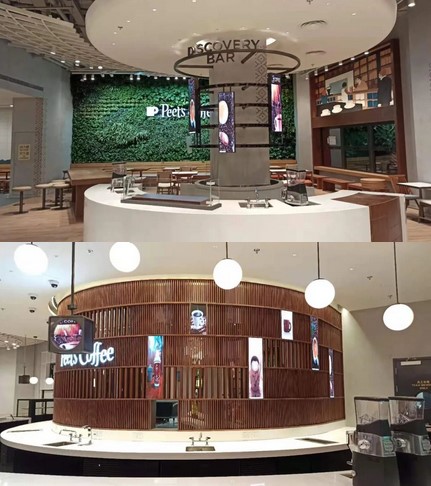 今年会·(jinnianhui)金字招牌诚信为皮爷咖啡量身打造不同规格的展示屏,在满足功能的基础上打造时尚优雅的环境氛围。