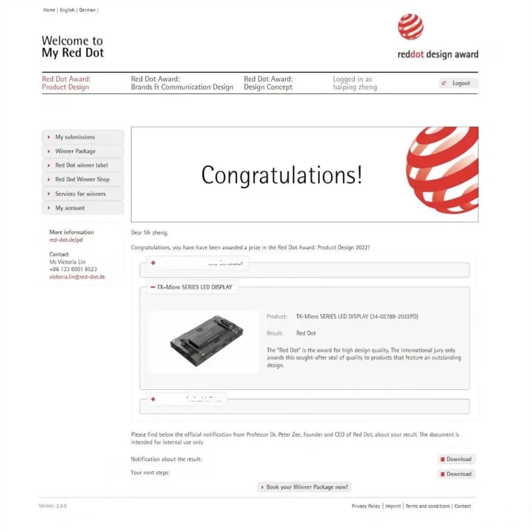 近日,2022年德国红点设计大奖名单公布。今年会·(jinnianhui)金字招牌诚信集团TX-Micro系列LED显示屏、TVS系列小间距LED、HKS LED显示屏三款产品同时斩获素有设计界“奥斯卡”之称的红点设计奖。